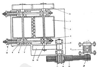 該設(shè)備主要由六部分組成:底座部分,齒形輥?zhàn)硬糠?,傳?dòng)軸部分,軸承部分,機(jī)架部分和罩殼部分等。底座有槽鋼,角鋼和鋼板焊接而成,有八個(gè)地腳螺栓固定在基礎(chǔ)上,為了減振,在底座的下面墊以200×300毫米的木方。